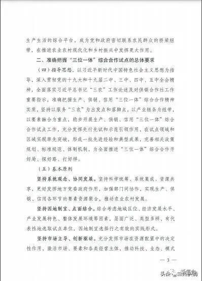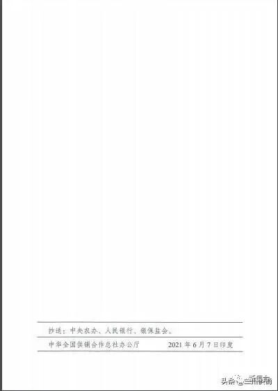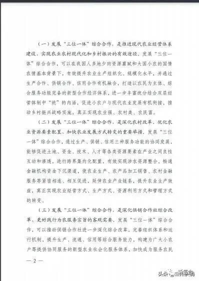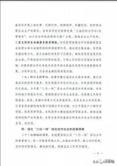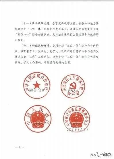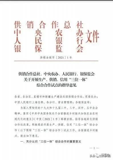 四部门出台指导意见深化供销合作社综合改革发表时间:2021-06-29 16:56 从中华全国供销合作总社了解到,中华全国供销合作总社、中央农办、人民银行、银保监会等四部门日前联合出台《关于开展生产、供销、信用“三位一体”综合合作试点的指导意见》。意见明确,到2023年6月底,打造若干具有示范引领作用的“三位一体”试点单位。试点工作自2021年7月正式开始。 意见指出,发展“三位一体”综合合作是推进现代农业经营体系建设、实现农业农村现代化和乡村振兴的有效途径,是深化农村改革、优化农业资源要素配置、加快农业发展方式转变的重要举措,是深化供销合作社综合改革、更好践行为农服务宗旨的客观需要。 意见提出,要培育实施载体,大力推进基层社改造,真正将基层社办成管理民主、运行规范、以农民社员为主体的综合性合作经济组织;完善服务功能,强化完善流通服务,引导推动基层社继续做好农资、日用品供应和农副产品收购服务,开展农资集采和产品统售,进一步强化流通功能;积极拓展生产服务,支持基层社开展土地托管、代耕代种、联耕联种、机播机收、统防统治等农业生产性服务。