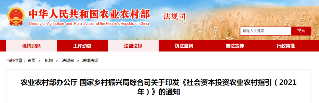 农业农村部 国家乡村振兴局:社会资本投资农业农村指引(2021年)发表时间:2021-05-10 08:48 ![]() 农业农村部办公厅 国家乡村振兴局综合司关于印发《社会资本投资农业农村指引(2021年)》的通知 各省、自治区、直辖市及计划单列市农业农村(农牧、畜牧兽医、海洋渔业)厅(局、委)、乡村振兴(扶贫)部门,新疆生产建设兵团农业农村局、扶贫办,北大荒农垦集团有限公司,广东省农垦总局: 全面实施乡村振兴战略的深度、广度、难度都不亚于脱贫攻坚,必须加强顶层设计,以更有力的举措、汇聚更强大的力量来推进。社会资本是全面推进乡村振兴、加快农业农村现代化的重要支撑力量,需要加大政策引导撬动力度,扩大农业农村有效投资。根据十九届五中全会、中央一号文件、第十四个五年规划和2035年远景目标纲要等明确的农业农村发展目标和重大任务,我们对2020年4月制定的《社会资本投资农业农村指引》进行了修订,形成《社会资本投资农业农村指引(2021年)》,现印发你们。请结合本地实际,充分发挥财政政策、产业政策引导撬动作用,引导好、保护好、发挥好社会资本投资农业农村的积极性、主动性,切实发挥社会资本投资农业农村、服务乡村全面振兴的作用。 农业农村部办公厅 国家乡村振兴局综合司 2021年4月22日 社会资本投资农业农村指引(2021年) (一)指导思想 以习近平新时代中国特色社会主义思想为指导,按照新发展阶段优先发展农业农村、全面推进乡村振兴的总体部署,坚持创新驱动发展,深入推进农业供给侧结构性改革,把乡村建设摆在社会主义现代化建设的重要位置,突出“保供固安全、振兴畅循环”,聚焦乡村振兴重点领域,创新投融资机制,营造良好营商环境,激发社会资本投资活力,更好满足全面推进乡村振兴多样化投融资需求,为粮食、生猪等重要农产品稳产保供、解决好种子与耕地两个要害问题、巩固拓展脱贫攻坚成果同乡村振兴有效衔接、大力实施乡村建设行动提供有力支撑。 (二)基本原则 1.尊重农民主体地位。充分尊重农民意愿,切实发挥农民在乡村振兴中的主体作用,引导社会资本与农民建立紧密利益联结机制,不断提升人民群众获得感。支持社会资本依法依规拓展业务,注重合作共赢,多办农民“办不了、办不好、办了不合算”的产业,把收益更多留在乡村;多办链条长、农民参与度高、受益面广的产业,把就业岗位更多留给农民;多办巩固拓展脱贫攻坚成果、帮农带农的产业,带动农村同步发展、农民同步进步。 2.遵循市场规律。充分发挥市场在资源配置中的决定性作用,更好发挥政府作用,引导社会资本将人才、技术、管理等现代生产要素注入农业农村,加快建成现代农业产业体系、生产体系和经营体系。坚持“放管服”改革方向,建立健全监管和风险防范机制,营造公平竞争的市场环境、政策环境、法治环境,降低制度性交易成本,创造良好稳定的市场预期,吸引社会资本进入农业农村重点领域。 3.坚持开拓创新。鼓励社会资本与政府、金融机构开展合作,充分发挥社会资本市场化、专业化等优势,加快投融资模式创新应用,为社会资本投资农业农村开辟更多有效路径,探索更多典型模式。有效挖掘乡村服务领域投资潜力,拓宽社会资本投资渠道,保持农业农村投资稳定增长,培育经济发展新动能,增强经济增长内生动力。 对标全面推进乡村振兴、加快农业农村现代化目标任务,立足当前农业农村新形势新要求,聚焦农业供给侧结构性改革和乡村建设的重点领域、关键环节,促进农业农村经济转型升级。 (一)现代种养业。支持社会资本发展规模化、标准化、品牌化和绿色化种养业,推动品种培优、品质提升、品牌打造和标准化生产,助力提升粮食和重要农产品供给保障能力。巩固主产区粮棉油糖胶生产,大力发展设施农业,延伸拓展产业链,增加绿色优质产品供给。鼓励社会资本大力发展青贮玉米、高产优质苜蓿等饲草料生产,发展草食畜牧业。支持社会资本加快构建现代养殖体系,合理布局规模化养殖场,稳定生猪基础产能,加大生猪深加工投资,加快形成养殖与屠宰加工相匹配的产业布局,健全生猪产业平稳有序发展长效机制;积极发展牛羊产业,增加基础母畜存栏;稳步推进禽肉等产业发展,增加肉类市场总体供应。鼓励社会资本建设优质奶源基地,升级改造中小奶牛养殖场,做大做强民族奶业。鼓励社会资本发展水产绿色健康养殖,开展集约化、工厂化循环水养殖、稻渔综合种养、大水面生态养殖、盐碱水养殖和深远海智能网箱养殖,推进海洋牧场和深远海大型智能化养殖渔场建设,加大对远洋渔业的投资力度。 (二)现代种业。鼓励社会资本投资创新型种业企业,推进科企深度融合,支持种业龙头企业健全商业化育种体系,提升商业化育种创新能力,提升我国种业国际竞争力。引导社会资本参与现代种业自主创新能力提升,加强种质资源保存与利用、育种创新、品种检测测试与展示示范、良种繁育等能力建设,促进育繁推一体化发展,建立现代种业体系。在尊重科学、严格监管的基础上,鼓励社会资本积极参与生物育种产业化应用。创新推广“龙头企业+优势基地”模式,支持社会资本参与国家南繁育种基地建设,推进甘肃、四川国家级制种基地建设与提档升级,加快制种大县和区域性良繁基地建设。鼓励社会资本投资畜禽水产保种