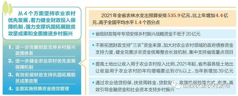 积极支持农业农村优先发展——省委“三农”重要政策文件解读(下)发表时间:2021-04-29 09:44 ![]() 全面推进乡村振兴、加快农业农村现代化,需要钱、地、人等多方面的支持。我省财政、金融、土地等相关部门,先后出台具体政策措施,落实农业农村优先发展,支持巩固拓展脱贫成果,全面护航乡村振兴。 把农业农村作为一般公共预算 优先保障领域 今年中央一号文件明确提出,继续把农业农村作为一般公共预算优先保障领域。省财政厅副厅长安晓飞表示,要紧紧围绕乡村振兴战略,坚持农业农村优先发展,着力健全财政投入保障机制,强力支撑巩固拓展脱贫攻坚成果和全面推进乡村振兴。主要采取4个方面12项举措。 首先,进一步完善财政支持乡村振兴政策体系。今年拟制定出台《建立完善乡村振兴财政保障机制的实施意见》《衔接推进乡村振兴补助资金管理办法》《过渡期脱贫县涉农资金统筹整合政策》《财政支持农业高质量高速度发展政策》《财政支持晋中国家农高区(山西农谷)发展意见》五项支持政策,全方位建立农业农村优先发展长效机制。 其次,进一步健全农业农村优先发展保障机制,加快形成财政优先保障、金融重点倾斜、社会积极参与的多元投入格局。公共预算优先保障农业农村支出,2021年全省农林水支出预算安排535.9亿元,比上年增加4.4亿元,高于全国平均水平1.4个百分点。省级财政每年专项安排乡村振兴战略资金不低于20亿元;不断拓宽财政支持“三农”资金来源,加大对农业农村领域的政府债券资金支持力度,健全完善涉农资金统筹整合长效机制,集中支持省级重点项目;提高土地出让收入用于农业农村投入比例,2021年起,省市县各级土地出让收益用于农业农村的年均增幅要达到6%以上,当年新增加39亿元;通过农业信贷担保、扶贫周转金、贷款贴息、政策性保险等方式,有序、高效引导金融资金和社会资本支持乡村振兴。深入开展农业农村领域政府和社会资本合作,推进乡村振兴领域PPP项目。省财政积极探索“PPP+一事一议”美丽乡村试点建设筹资机制,计划筹资100亿元,用于建设美丽乡村。 第三,有效衔接财政支持巩固拓展脱贫成果政策。在过渡期内保持“两个不变”,即财政支持政策举措不变和财政投入资金总量不变。财政支持政策举措不变包括过渡期内脱贫县涉农资金整合政策不变;省级财政相关转移支付倾斜支持脱贫地区政策不变;特色农产品产业支撑项目贷款贴息政策不变;政府采购引导支持脱贫地区产业发展、采购脱贫地区农副产品政策不变。财政投入资金总量不变,即衔接资金预算安排规模保持不变,继续按照2020年标准安排,重点支持产业发展。 第四,全面实施预算资金绩效管理。项目实施中建立健全项目执行定期调度督导机制,确保财政资金安全规范有效使用。项目实施后发挥绩效评价“指挥棒”作用,对绩效评价结果一般的资金督促改进,对低效无效的资金调减或取消预算安排,通过建立“花钱必问效”机制,进一步提高资金使用效益。 创新金融产品服务模式更好服务“三农” 金融是乡村振兴的重要支撑,“十四五”期间,我省金融机构如何创新金融产品、服务模式,更好地服务“三农”?省地方金融监管局副局长张永胜表示,省委关于“三农”的这3个重要政策文件提出创优涉农金融环境、创新涉农金融服务、加大涉农金融支持等政策要求,为全省“三农”事业实现高质量高速度发展提供了强有力的金融政策支撑。金融要从两个方面发力: 首先,优化区域金融供给,加大涉农信贷投入。一要用足用好国家金融支持政策。贯彻国家关于再贷款货币政策工具的安排部署,做好支农、支小、扶贫再贷款争取工作。落实普惠金融定向降准政策,鼓励引导地方法人金融机构加大“三农”信贷投放力度。二要充分调动全省金融机构积极性。通过加强地方政府与金融机构合作、实施金融支持经济社会发展成效评价、信贷风险补偿等手段,推动金融机构结合职能定位和业务范围,加大对县域地区信贷投入,支持开发性、政策性金融机构为乡村振兴提供中长期信贷服务。三要推动金融机构同向发力。充分发挥农业信贷融资担保作用,进一步增大农业信贷担保规模,引导带动银行、保险等金融机构更好地满足农业农村发展资金需求。 其次,优化金融生态,提升金融服务质效。补齐要素短板、完善政策体系、创新金融产品和服务助力乡村振兴。支持以市场化方式设立乡村振兴基金,支持金融机构发行“三农”专项金融债券,用于巩固脱贫攻坚成果和支持乡村振兴。鼓励市县构建域内共享的涉农信用信息数据库,发展农村数字普惠金融。实施资本市场县域工程,开辟“绿色通道”,加快农业龙头企业股改上市步伐,借助资本市场实现跨越式发展。制定出台过渡期内脱贫人口小额信贷有关政策。持续开展特色农业保险和防止返贫致贫保险。探索建立金融支持产业发展带动脱贫户增收致富的挂钩机制。拓宽抵质押物范围,深入推进农村承包土地经营权、集体经营性建设用地使用权、林权、自然资源产权等抵押融资。开展大型农机具、温室大棚、养殖圈舍、生物活体抵押贷款试点。依法合规开展农产品仓单、农业保险保单质押贷款。扩大主粮作物完全成本和收入保险试点范围,积极推进产粮大县农业大灾保险试点开展,探索发展农业价格保险、