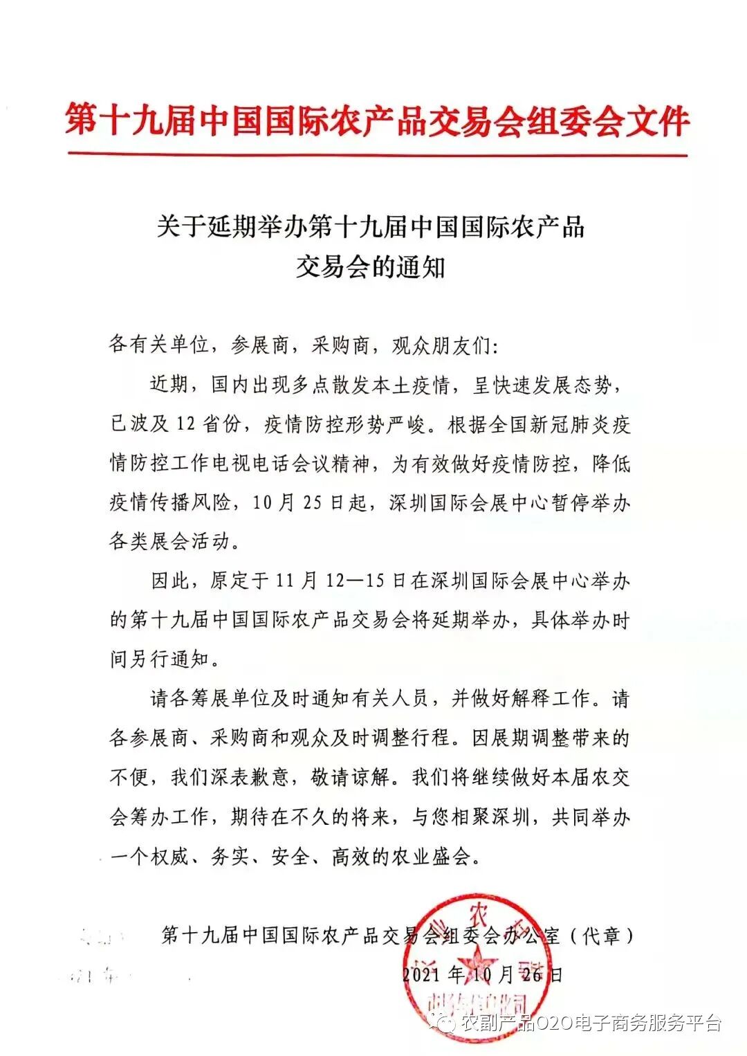 关于延期举办第十九届中国国际农产品交易会的通知发表时间:2021-11-02 22:15 尊敬的参展商、观众和合作伙伴: 鉴于当前新冠肺炎疫情在国内部分地区扩散,根据深圳市当地最新防疫要求,原计划于2021年11月12-15日在深圳国际会展中心(宝安新馆)举办的第十九届中国国际农产品交易会将延期举办,具体日期将于近期另行通知。观众报名系统继续正常开放,以便确认时间后及时通知您。 感谢广大参展商、采购商和社会各界对本届中国国际农产品交易会的关心和支持,对于展会延期带来的诸多不便,我们深表歉意! 第十九届中国国际农产品交易会组委会 2021年10月26日