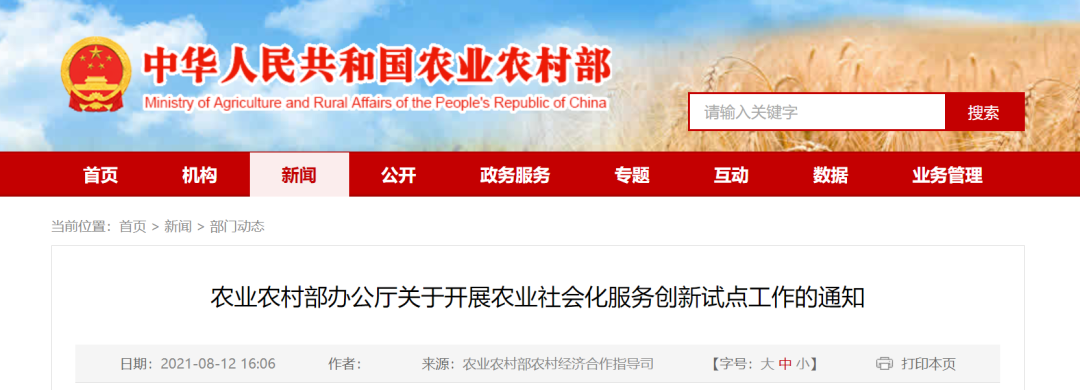 农业社会化服务创新试点工作开始啦!发表时间:2021-08-17 20:42 近日,农业农村部办公厅印发了《关于开展农业社会化服务创新试点工作的通知》,要求以推动农业高质量发展为主题,以促进小农户和现代农业有机衔接为主线,以培育农业服务业战略性大产业为目标,鼓励地方因地制宜开展试点,积极探索创新农业社会化服务的业态、模式、机制,着力打造一批创新基地,培育一批创新组织,形成一批创新模式,将重点围绕农业社会化服务创新试点县和试点组织两个层面开展试点。 全文