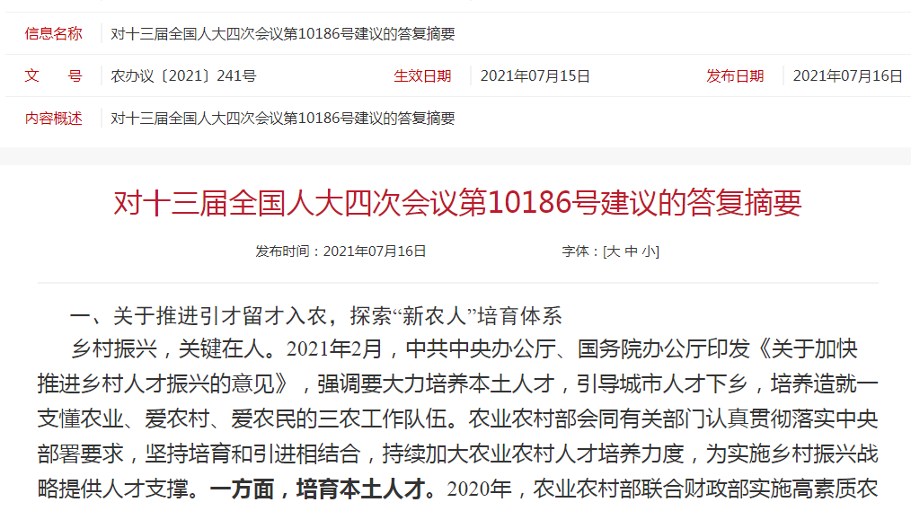 摘要内容如下: 一、关于推进引才留才入农,探索“新农人”培育体系 乡村振兴,关键在人。 2021年2月,中共中央办公厅、国务院办公厅印发《关于加快推进乡村人才振兴的意见》,强调要大力培养本土人才,引导城市人才下乡,培养造就一支懂农业、爱农村、爱农民的三农工作队伍。